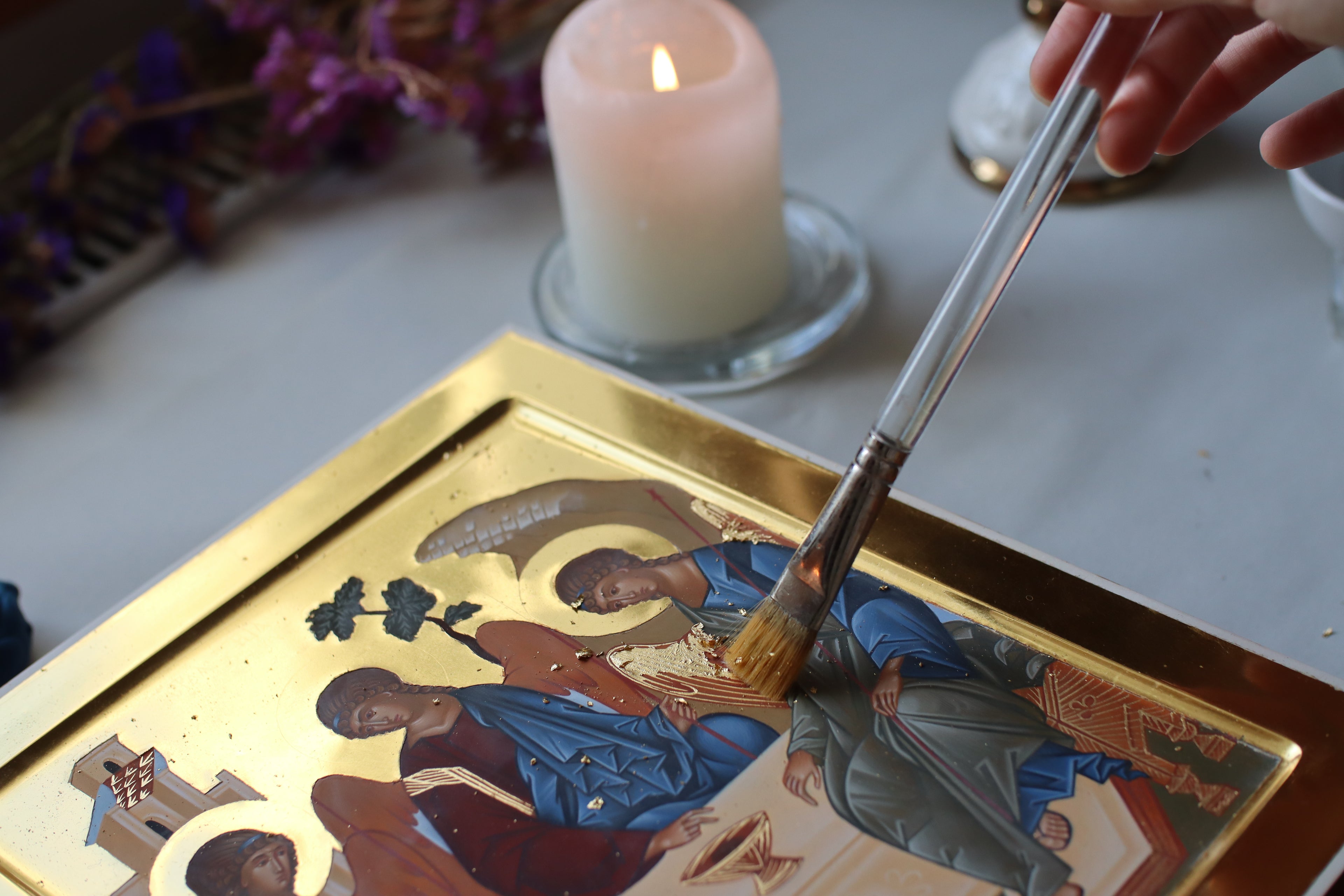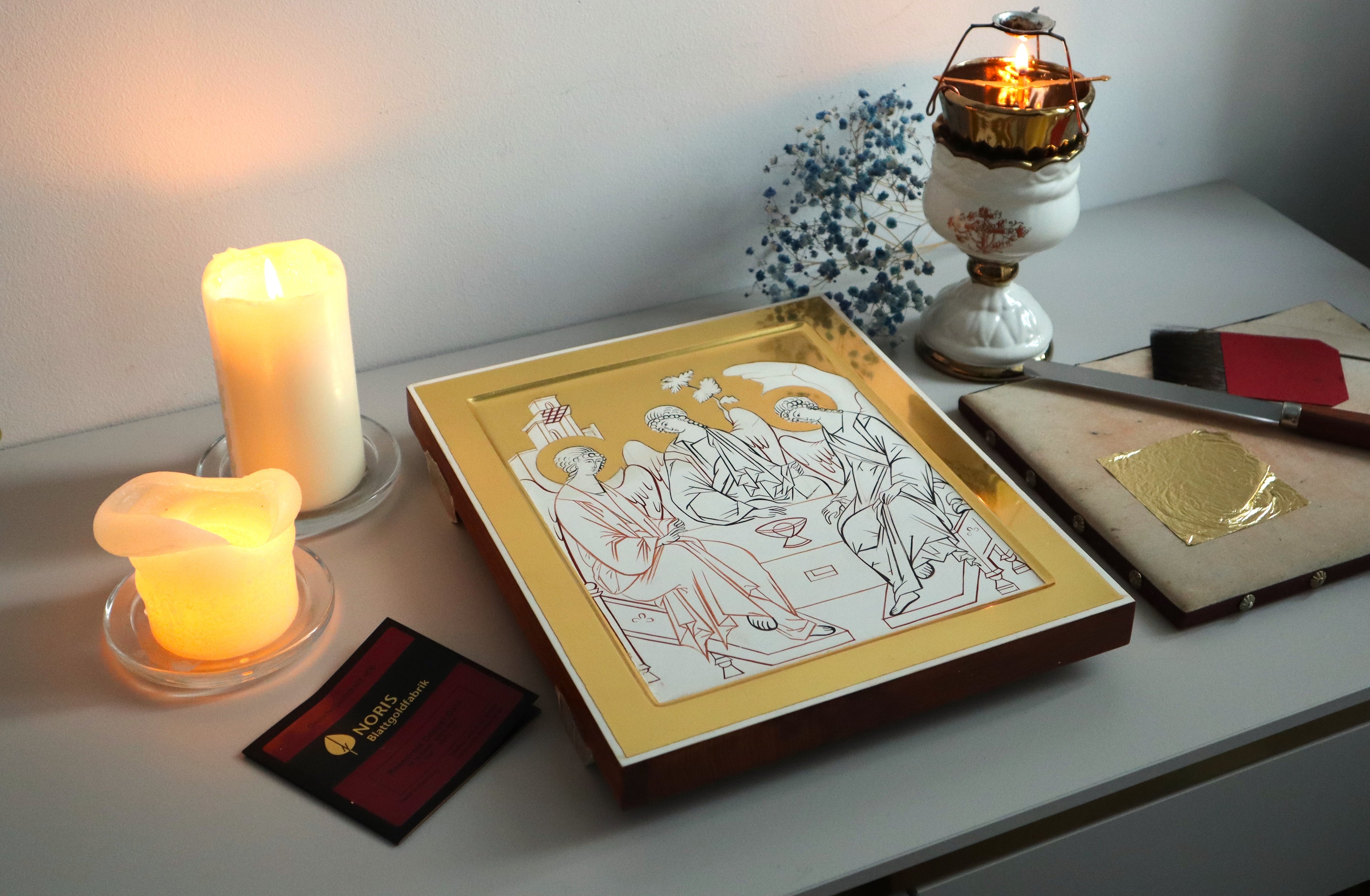 Gold in the icon symbolizes Divine light, eternity, and the presence of the Heavenly Kingdom. For gilding, real 23.75–24 carat gold leaf is used.